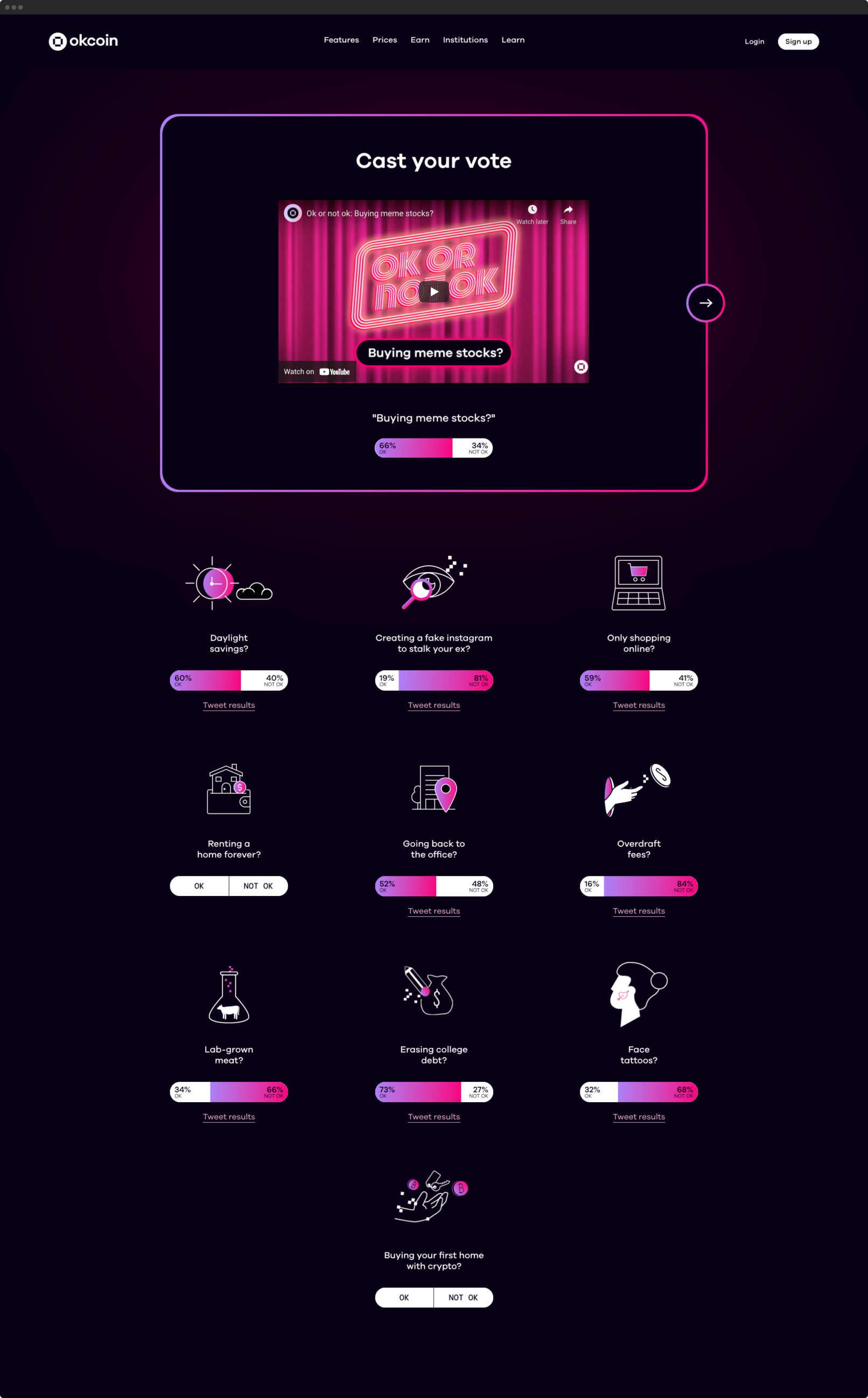 Okcoin.com asked for a social campaign that focuses and trending topics on social platforms to promote its crypto trading platform. We made a 70s inspired game show featuring Ali Kolbert asking if trending topics are OK or not OK. The answers are actual polled results to the questions on social platforms, but with a comedic twist. The web experience connected directly to results from social so our participants could see all the content and questions being asked in one place and tweet out their answer after each question.